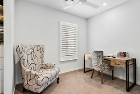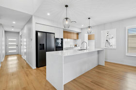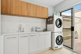 At the heart of the home, the beautifully appointed kitchen showcases a sophisticated blend of winter white and warm timber tones, enhanced by elegant stone benchtops. A generous breakfast bar, quality stainless steel appliances and intelligent layout ensure both style and practicality. The adjoining butler's pantry, integrated laundry and private drying court complete a highly functional yet discreet workspace.