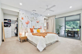 The indulgent master suite is thoughtfully positioned at the rear, capturing peaceful rainforest views and offering the luxury of a generous walk-through robe and a beautifully appointed ensuite featuring twin vanities, an oversized shower, and a freestanding designer bath. A second ensuited bedroom at the front of the home ensures comfort and privacy.