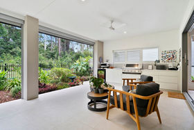 Perfectly designed for relaxed indoor outdoor living, the home flows to an elegant alfresco terrace with a fully built in outdoor kitchen, enclosed with automated sunshade blinds for year round comfort. Overlooking tranquil bushland and low-maintenance landscaped gardens, this serene retreat is ideal for morning coffee, long lunches, or evening entertaining in total privacy.