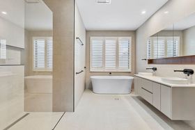 The generous master suite is privately positioned at the rear, capturing serene lakeside outlooks and offering a walk through robe and luxurious ensuite with bespoke fixtures and featuring a free standing bath tub. Two additional bedrooms are thoughtfully located toward the front of the home and are serviced by a spacious central bathroom.